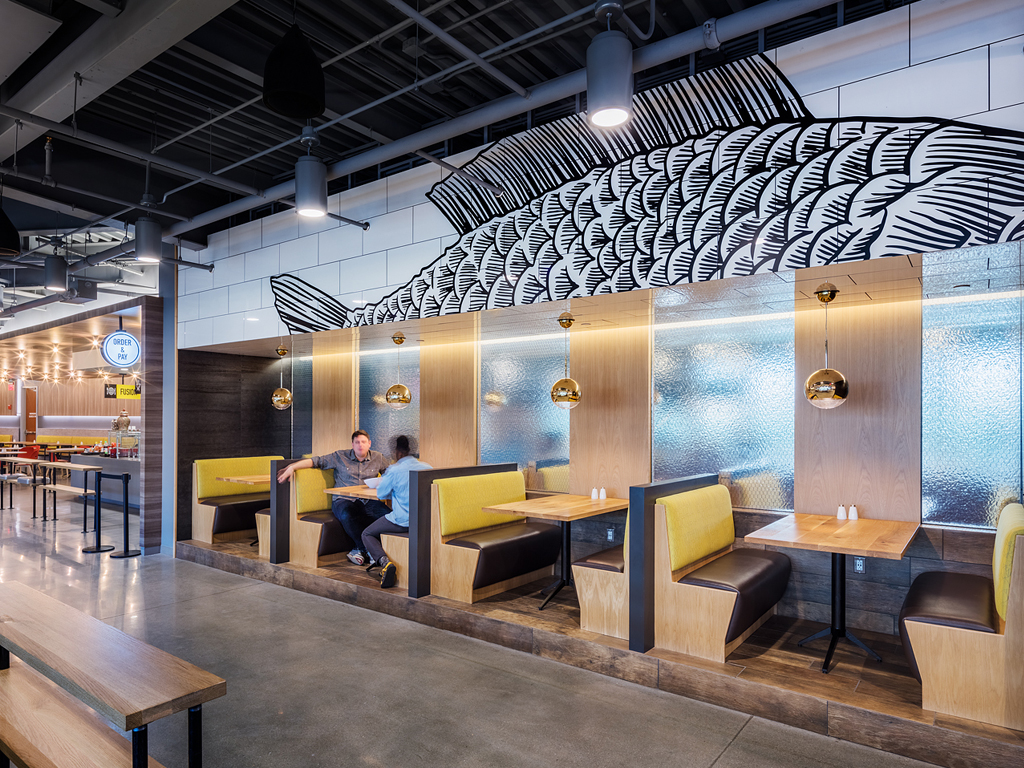 To create an identity and a market feel experience for a corporate food hall with a diverse experience through a culinary journey. Our goal was to design and implement a wide range of custom graphics and signage elements to create a multi-sensorial dining experience.