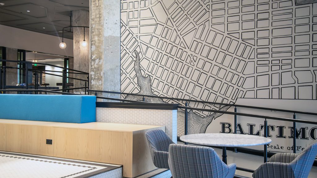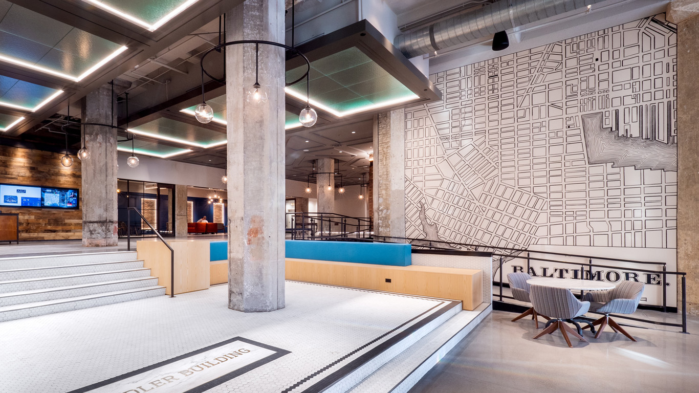 The design process became a research project of the site’s celebrated and well documented history. Design elements with lots of attention to detail such as: a massive custom illustration of an old Baltimore map as a key feature in the lobby entrance, the additional use of historic photographs remastered at large scale and restored color dress the hallways, the green-tinted Coke glass that has been used to eternalize its past, and hand painted signs that help you discover a bit more about its initial tenants; these layers weld its revival to its rich and celebrated history. The design project was approached from an experiential perspective, where the customer experience lies at the heart to connect people to place. The result is a workspace that is cool, comfortable and functional where people spend their time and learn about their workplace neighborhood.